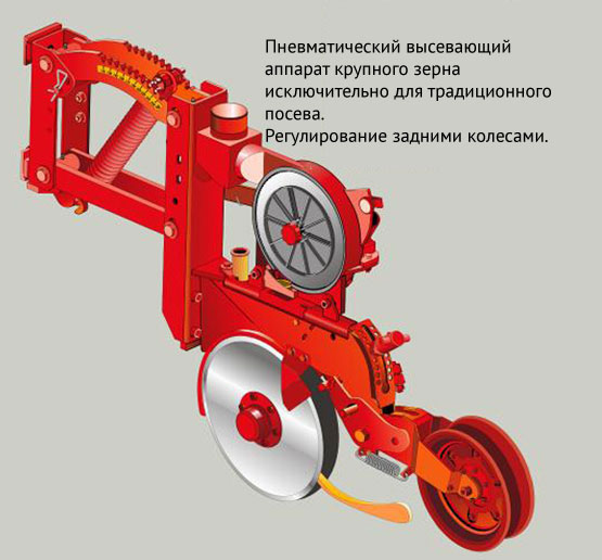 - Имеется пневматический комплект для посева кукурузы, подсолнечника, сои и сорго, зерно за зерном.
